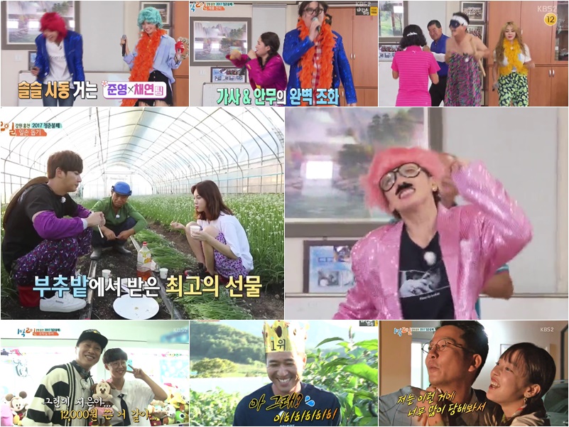 지난 8일 방송된 KBS 2TV ‘해피선데이-1박 2일 시즌3’(연출 유일용, 이하 '1박 2일')는 강원도 홍천 유치리 마을로 떠난 ‘2017 청춘불패 특집’ 두 번째 이야기가 그려졌다. 이날 '1박2일'은 '청춘불패'와의 콜라보레이션으로 모두 12명 멤버들이 프로 재롱러와 일일 일꾼으로 변신해 유치리 웃음꽃을 폭발시켰다.