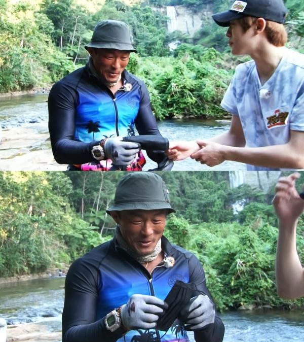 재현은 “가져온 물건을 다 두고 가겠다.”면서 자신이 챙겨왔던 물건을 형들에게 선물하기로 했다. 재현의 가방에서 양말과 선크림, 수건 등 생존 물품을 꺼내 아낌없이 나누던 중 한 아이템이 추성훈의 시선을 사로잡았다. 바로 아이돌의 공항 필수품 검정 마스크.