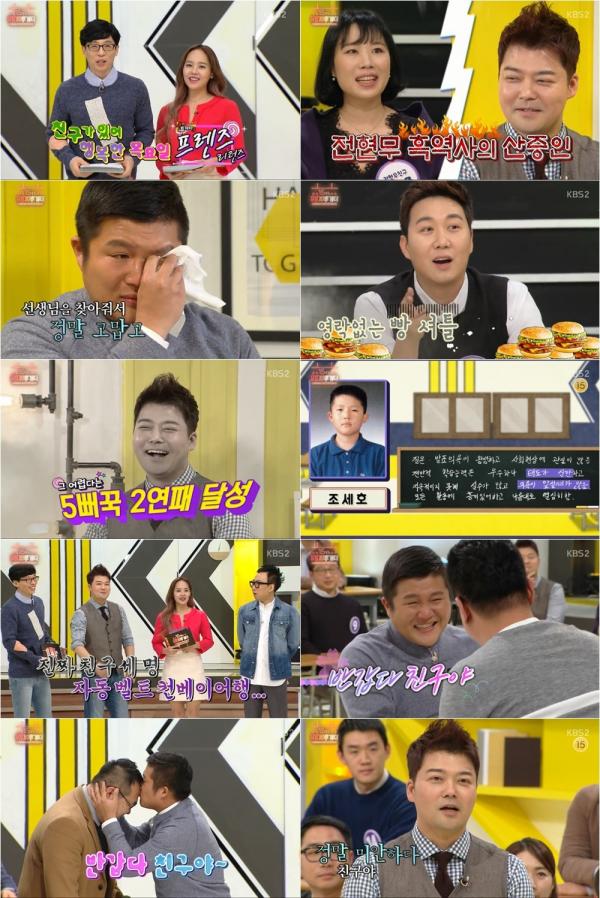매회 유쾌한 웃음과 뜨거운 화제를 불러모으고 있는 KBS 2TV ′해피투게더3′(이하 ‘해투’)의 지난 9일 방송은 ‘해투’ 15주년 특집 3부작의 1탄인 ‘프렌즈 리턴즈’ 편으로 꾸며졌다. 이날 방송에서는 ‘해투’의 MC로 활약하고 있는 전현무와 조세호의 친구를 찾았다. 조세호는 4명의 친구를 ‘숨은 친구 찾기’ 1라운드, 남은 한 명을 2라운드에서 찾아냈고, 전현무는 1, 2라운드 도합 3명의 친구밖에 찾아내지 못하며 “미안하다 친구야”를 외쳐야 했다. 이 과정에서 유쾌한 웃음과 가슴 찡한 감동이 이어지며 다시 봐도 재미있는 레전드 예능의 힘을 재확인케 했다.