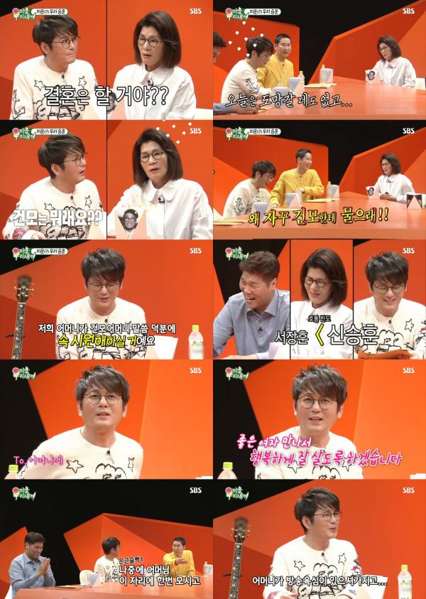 이날 방송에서는 전주에 이어 가수 신승훈이 스페셜 MC로 출연했다. 일명 ‘미우새 끝판왕’ 신승훈은 어머니들에게 애정 가득한 잔소리 세례를 듬뿍 맞으며 수도 없이 “결혼하겠습니다” 맹세해 웃음을 선사했다.