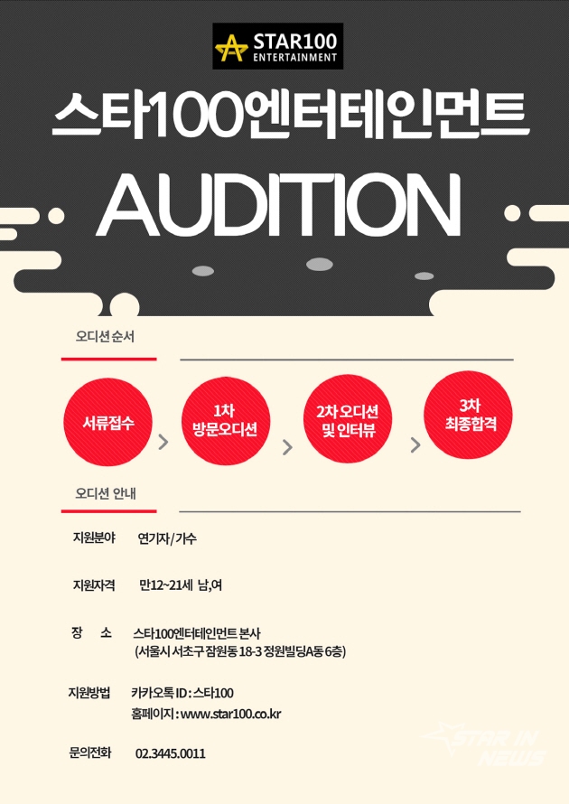 ㈜스타100 100% 스타를 만들겠다는 모토로 2015년에 설립된 엔터테인먼트 회사로 작년 8월부터 본격적으로 매주 토요일마다 상시오디션을 통해 가능성 있는 지망생들을 선발하고 있다.