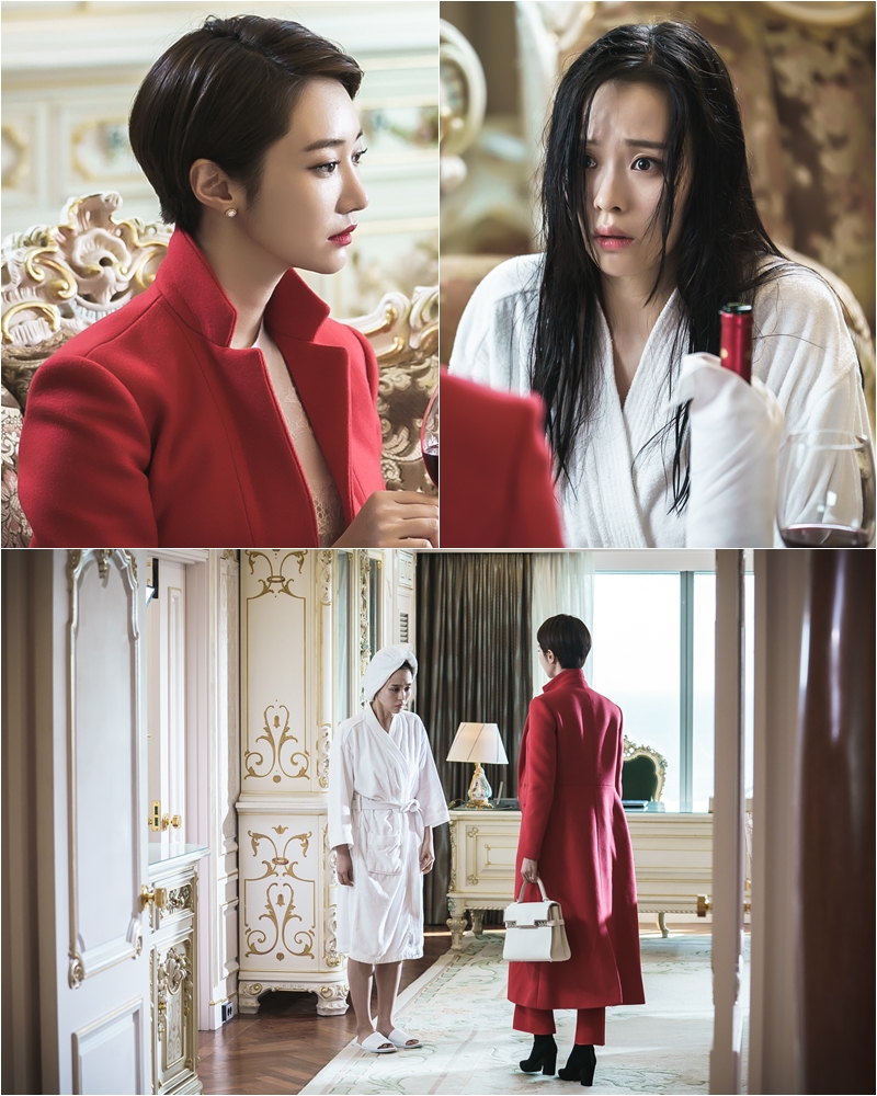 이 가운데 공개된 스틸에는 고준희와 지윤하가 호텔에 함께 있는 모습이 담겨 있어 보는 이들의 눈길을 끈다. 강렬한 레드 의상으로 독보적 아우라를 뽐내고 있는 고준희와 달리 지윤하는 머리도 채 말리지 못한 샤워가운 차림의 무방비 상태. 특히 ‘김성균 내연녀’ 지윤하를 바라보는 고준희의 얼음장 같이 싸늘한 눈빛에서 범접할 수 없는 위압감이 느껴질 정도다.