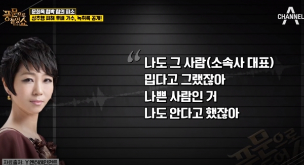 해당 녹취록에서 후배 가수가 문희옥에게 "소속사 대표로부터 성추행 당했다"고 밝히자 문희옥은 "나도 소속사 대표 밉다고 했잖아. 나쁜 사람인 거 나도 알아"라고 한 뒤 "사장님은 실형 살고 나오면 되지만 너네 식구들은 타격이 더 커"라며 후배 가수를 나무랐다.