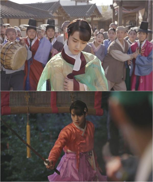 그런가하면 또 다른 사진 속에서는 아름다운 여인의 복색과는 어울리지 않게 칼을 빼어 든 채 누군가와 대치하는 여원의 긴장감 넘치는 위기상황이 펼쳐진다. 해당장면은 ‘조선미인별전’ 1회와 2회를 잇는 중요한 대목으로 단 한 컷만으로도 여장남자 여원의 중성적인 매력과 강렬한 카리스마를 동시에 엿볼 수 있어 본 방송에 대한 기대감을 급상승시키고 있다.