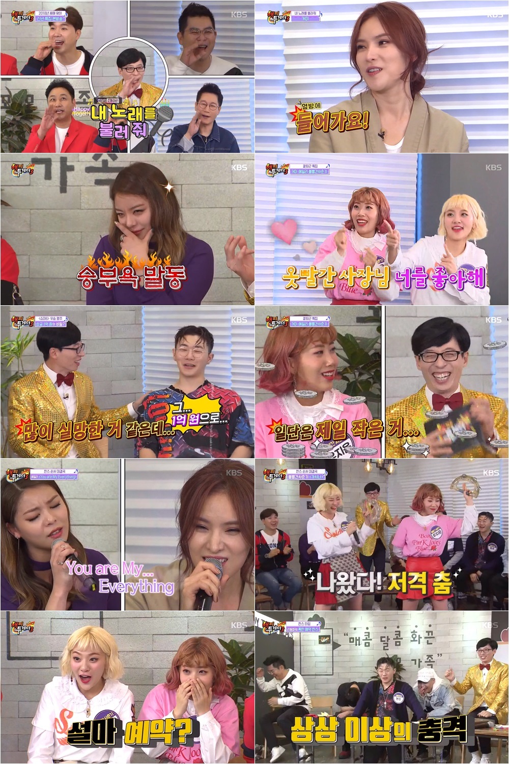 목요일 밤의 터줏대감 KBS 2TV ′해피투게더3′(이하 ‘해투3’)의 4일 방송은 신년맞이 특집으로 ‘전설의 조동아리-내 노래를 불러줘’ 코너가 단독으로 방송됐다. 이날 방송에서는 ‘음원 최강자’들인 거미-에일리-리듬파워-볼빨간 사춘기가 ‘칼퇴 특집’이라는 이름 하에 물러설 수 없는 자존심 대결을 펼쳐 시청자들의 눈길을 단단히 사로잡았다. 특히 웃음보를 자극하는 솔직 토크, 절로 귀호강을 부르는 가수들의 라이브, 쫄깃한 본 게임에 반전의 결과까지 더해지며 2018년 첫 번째 방송부터 풍성한 재미가 시청자들의 오감을 만족케 했다.