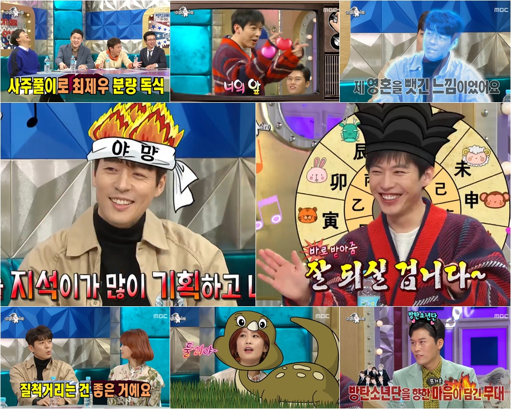 그는 자신을 제외한 게스트의 신년운세를 개인기로 준비해왔는데 프리 아나운서계 넘버쓰리를 꿈꾸는 김일중에겐 ‘경쟁자가 있다’며 열심히 해야 한다고 조언하는 한편, 서지석의 남다른 ‘승부욕’을 짚어내 모두의 시선을 집중시키기 했다. 그런가하면 오랜만에 추는 ‘짱’ 댄스까지 춤 DNA를 되살린 그는 시종일관 해맑게 웃는 모습으로 시청자 마음까지 스틸했다.