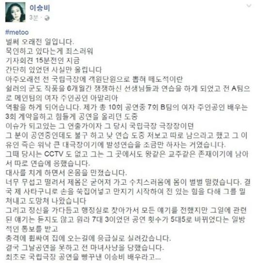 이승비 극단 나비꿈 대표(42)는 19일 자신의 페이스북에 #metoo 해시태그와 함께 “묵인하고 있다는 게 죄스러워 간단히 있었던 사실만 올립니다”라고 글을 남겼다.