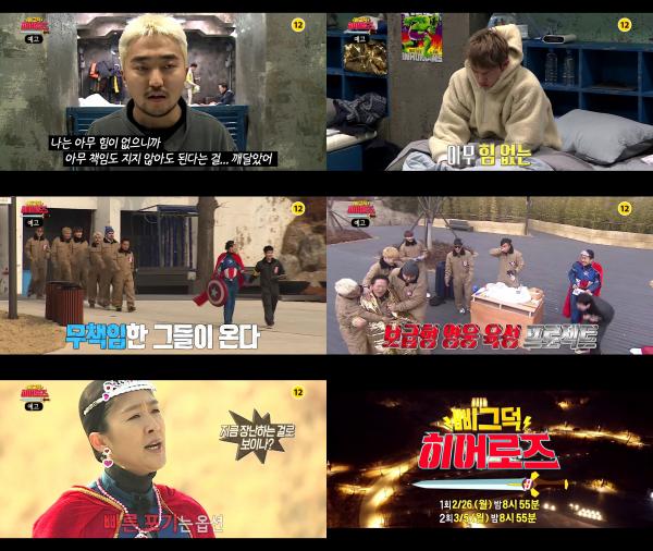 이어서 ‘아무 힘없는 무책임한 그들이 온다’라는 자막과 함께 1박 2일 합숙을 거친 후보생들의 순탄치 않은 모습이 담겨있어 시청자들의 시선을 사로잡는다. 우현, 안정환, 자이언티, 유병재, 허정민, 샘 해밍턴, 세븐틴 호시 등 7명의 영웅 후보들은 ‘캡틴홍’ 홍진경의 지도 아래 영웅이라면 갖춰야할 덕목들을 평가받는 다양한 미션을 수행할 예정. 그러나 영상 속 영웅후보들은 ‘캡틴홍’의 지시를 따르기보다는 떠넘기기와 빠른 포기로 영웅과는 다소 거리가 먼 모습을 보여 폭소를 유발한다.