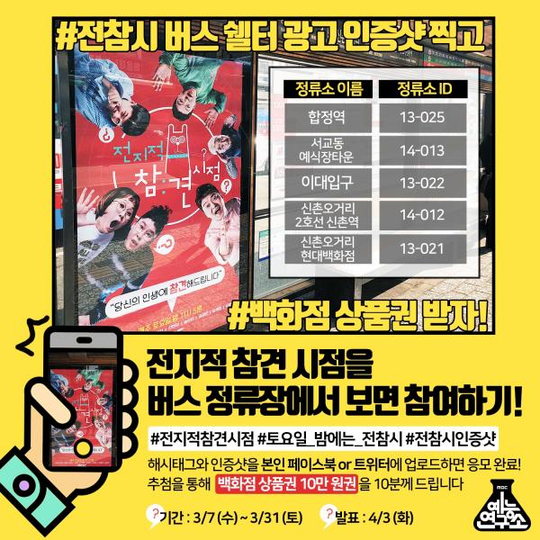 지난 7일 MBC는 예능연구소 페이스북(https://www.facebook.com/MBCentertain)을 통해 ‘전지적 참견 시점’ 버스 정류장 광고 인증샷 이벤트를 실시했다. 버스 정류장에서 ‘전지적 참견 시점’ 포스터를 사진으로 찍어 페이스북이나 트위터에 ‘#전지적참견시점 #토요일_밤에는_전참시 #전참시인증샷’이라는 해시태그와 함께 올리면 되는 간단한 이벤트다.