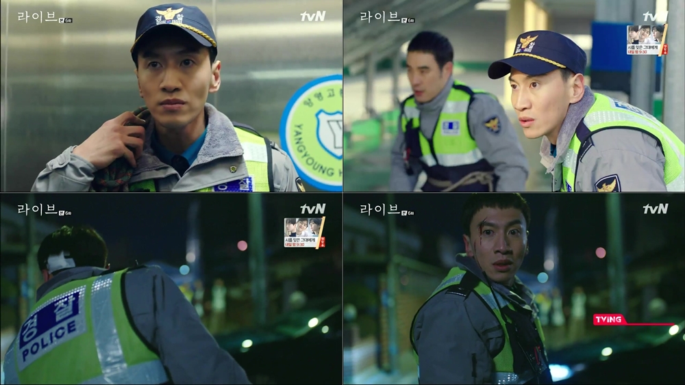 지난 25일 방송된 tvN 토일드라마 ’라이브(Live)‘(극본 노희경/연출 김규태/제작 스튜디오드래곤, 지티스트) 6회에서 홍일 지구대의 시보경찰 ’염상수‘역을 맡은 이광수가 끊임없이 벌어지는 사건사고 속에서 위기를 맞이하는 장면이 그려졌다.
