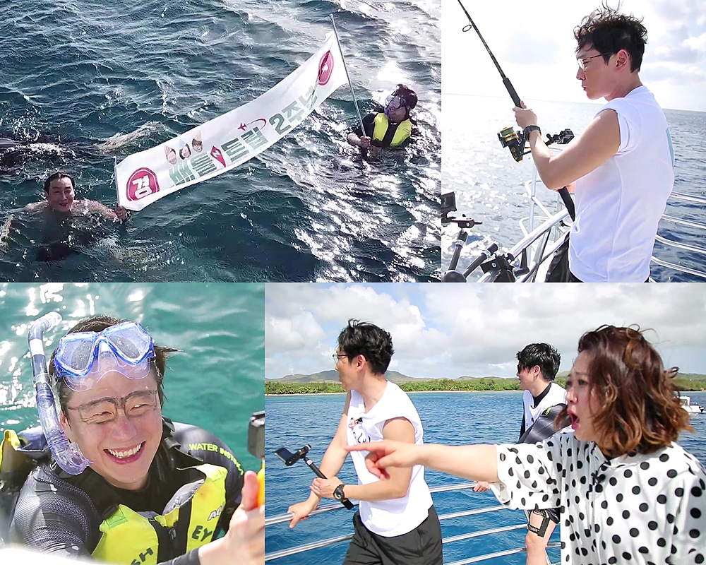 그런가 하면 공개된 스틸에는 스튜디오를 벗어나 직접 여행 설계에 나서 들뜬 MC들의 모습이 담겨 있다. 무엇보다 스노쿨링 중인 성시경의 비주얼이 폭소를 유발한다. 그의 얼굴에 뿔테 안경이 그려진 모습. 이는 “안경 벗으면 아무도 못 알아본다”는 성시경의 한탄에 김숙이 친히 신원 확인용으로 그려 준 것. 안경 그림으로 자신감을 얻은 성시경의 잇몸 만개한 광대 승천 미소에서 즐거움이 고스란히 느껴져 보는 이들까지 설레게 만든다. 이에 이휘재가 설계한 ‘돌핀 크루즈’가 담길 본 방송에 기대감이 증폭한다.
