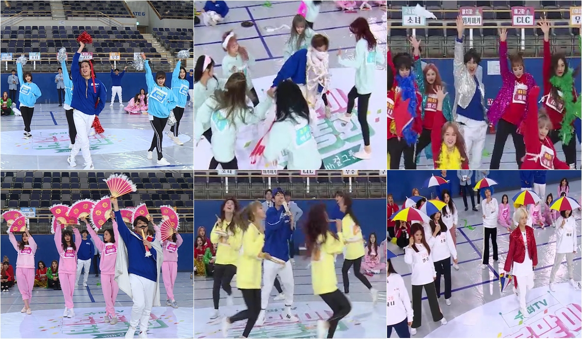 그런가 하면 은혁과 위키미키의 루아가 시선을 압도하는 듀엣 댄스를 선보였다. 두 사람의 양 옆에는 위키미키 멤버들이 부드럽게 그루브를 타며 음악에 몸을 맡기고 있다. 이도 잠시 음악이 전환되며 코믹댄스로 시선을 압도한다. 특히 은혁은 입술에 빨간 립스틱을 칠하고 위키미키의 중심에서 익살스러운 표정을 지어 기대감을 자아낸다. 신동 역시 ‘배고파’ 팀원인 CLC와 국악을 배경음악으로 한 웅장한 오프닝을 선보였다. 신동은 마치 소리꾼 같은 비주얼로 CLC의 부채를 일사분란하게 움직이는 장관을 선보인 것. 뿐만 아니라 ‘봄맞이 운동회’에 참여한 모든 아이돌의 춤까지 넣는 안무로 현장을 뜨겁게 달궜다는 전언이다.