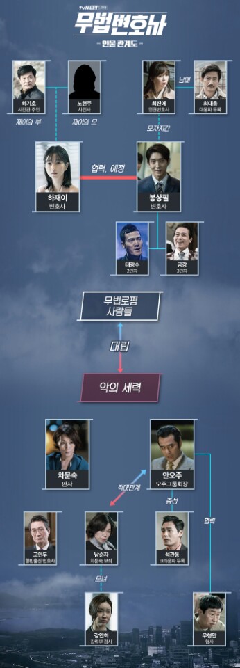 [스타인뉴스 김은영 기자] ‘무법변호사’ 속 인물들의 첨예한 대립각이 한 눈에 보이는 인물관계도가 공개돼 호기심을 자극하고 있다.