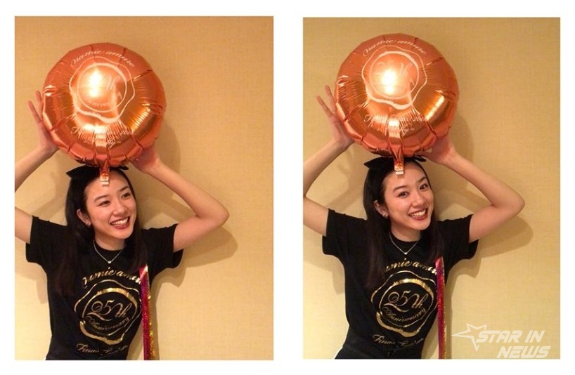 사진 속 나가노 메이는 풍선을 손으로 머리 위에 얹고 카메라를 응시하며 환한 미소를 짓고 있는 모습이다.