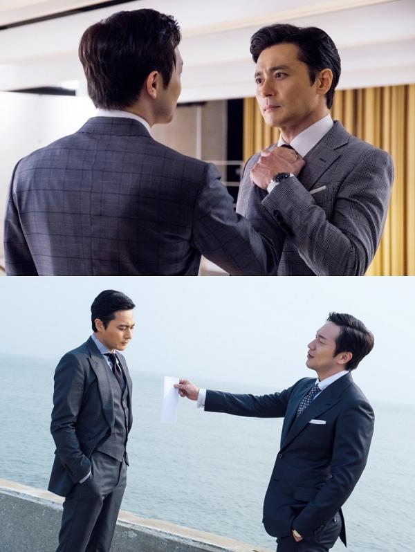 사진 속 장동건, 손석구는 드라마 제목처럼 멋진 슈트를 차려 입은 채 의문의 공간에서 마주서 있다. 가장 눈길을 끄는 것은 두 사람 사이의 심상치 않은 긴장감이다. 언제나 자신만만하던 장동건의 다소 긴장한 듯한 표정, 대번에 그의 멱살을 잡은 손석구, 그런 손석구의 손을 잡은 채 강한 눈빛으로 제압한 장동건. 사진 속 두 남자의 모든 모습이 긴장감을 불러 오는 것이다.