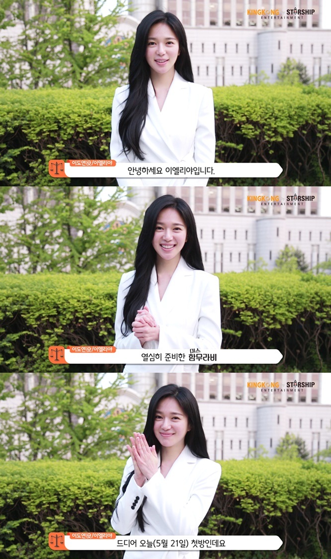 21일, 소속사 킹콩 by 스타쉽 측은 네이버 TV(tv.naver.com/kingkong)와 공식 유튜브 채널(youtube.com/KINGKONGEntertainmentOfficial)을 통해 JTBC 새 월화드라마 ‘미스 함무라비(극본 문유석, 연출 곽정환, 제작 스튜디오앤뉴)’에서 ‘이도연’ 역을 맡은 이엘리야의 본방사수 독려 영상을 공개했다.