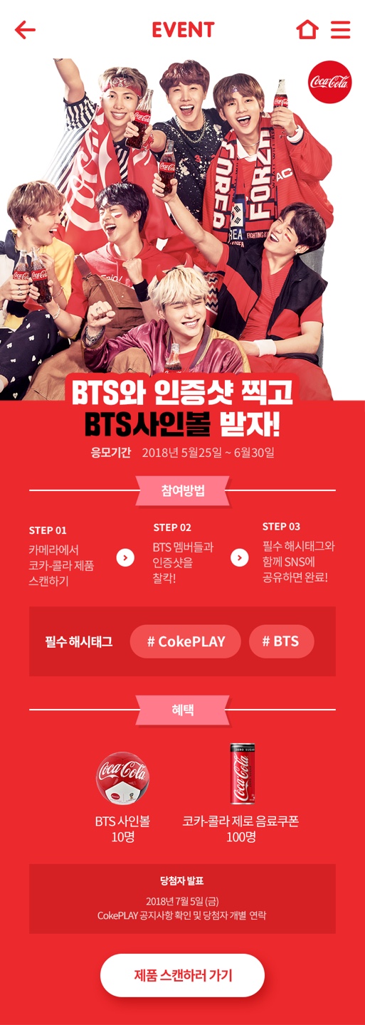 ‘방탄소년단과 인증샷 찍고 친필 사인볼 받자!’ 이벤트는 CokePLAY 앱 카메라로 코카-콜라 제품을 스캔하면 화면에 방탄소년단 멤버들이 나타나 함께 월드컵 응원 셀카를 찍을 수 있다. 방탄소년단 멤버들과 찍은 사진을 #CokePLAY, #BTS 등 필수 해시태그와 함께 SNS에 공유하면 응모가 완료된다. 응모한 사람들 중 추첨을 통해 총 10명에게 방탄소년단 멤버 전원의 친필 사인이 담긴 코카-콜라 볼을 증정한다. 오는 6월 30일까지 응모할 수 있으며, 당첨자 발표는 7월 5일이다.
