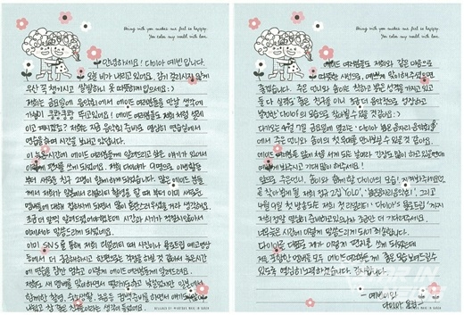 다이아를 대표로 제가 이렇게 편지를 쓰게 되었는데 저를 포함한 멤버들 모두 에이드 여러분들께 좋은 모습 보여드릴 수 있도록 열심히 노력하겠습니다. 감사합니다.