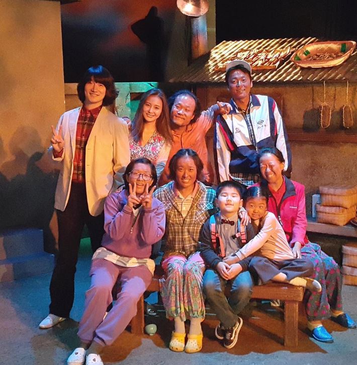 ​공개된 사진 속 안혜경은 연극 공연을 마치고 밝은 표정으로 동료 배우들과 기념 사진을 찍고 있다. 특히 섬마을을 대학로 무대에 옮겨 놓은 듯한