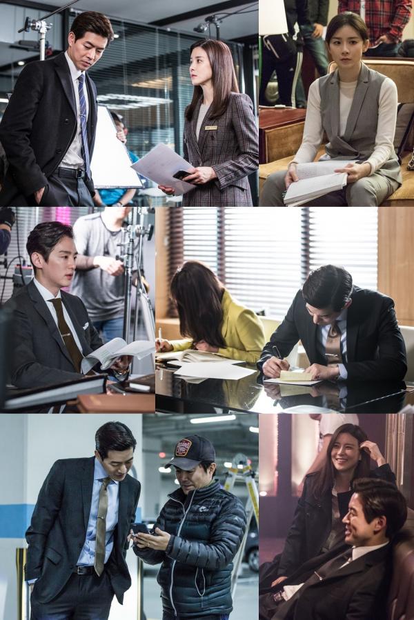법무법인 ‘태백’의 회의실에서 대본 공부 중인 이상윤(이동준 역), 권율(강정일 역), 박세영(최수연 역)의 모습도 포착됐다. 이상윤과 권율은 서로의 뒤통수를 치는 두뇌싸움으로 시청자들을 긴장과 반전 속으로 끌어당긴 주인공. 그 에너지를 고스란히 담은 현장의 모습은 뜨거운 학구열에 불타고 있는 듯하다. 이상윤은 박세영과 함께 대본에 필기까지 더하며, 권율은 주변 상황에 아랑곳 않는 대본 몰입력으로 시선을 사로잡는다.