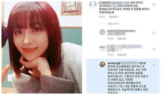 앞서 심은진은 지난 10일 자신의 SNS에 한 누리꾼이 남긴 댓글을 캡처해 올렸다. 댓글에는 “김기덕 감독과 심은진이 부적절한 관계이며, 촬영한 비디오가 언론을 통해 퍼지기 직전”이라는 내용이 담겨있었다.