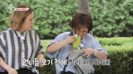 멤버들은 이날 김숙의 44번째 생일을 축하하러 뷔페를 찾았다. 네 사람은 모두 마치 약속이라도 한 듯 고무줄 의상으로 '뷔페룩'을 선보여 웃음을 줬다.