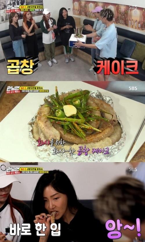 화사가 5일 방송된 SBS '런닝맨'에서 선물로 곱창케이크를 받았다.