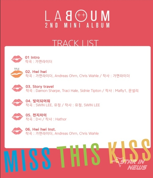 라붐(지엔, 솔빈, 해인, 소연, 율희, 유정)은 14일 공식 SNS 계정과 공식 유투브 채널을 통해 두 번째 미니앨범 'MISS THIS KISS'의 트랙리스트와 하이라이트 메들리 영상을 공개했다. 공개된 트랙리스트에는 총 6트랙이 담겨 있으며 '인트로(Intro)'와 타이틀곡 '휘휘(Hwi hwi)', 수록곡 'Story travel', '빛이 되어줘', '천지차이', 'Hwi hwi(휘휘) Inst'로 구성되어 있다.