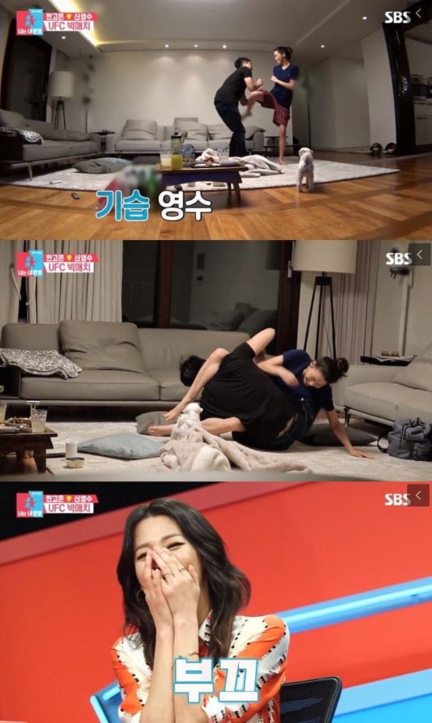 신영수는 “예전에 UFC따라하다 아내가 다친적이 있다. 아내에게 장난을 쳤는데 참더라 힘이 들어갔는데 (아내) 갈비뼈에 금이 갔다”고 말했다. 한고은은 “3개월 간 힘들었다. 다신 장난치지 말자고 했는데 여전히 그렇다”고 덧붙였다.