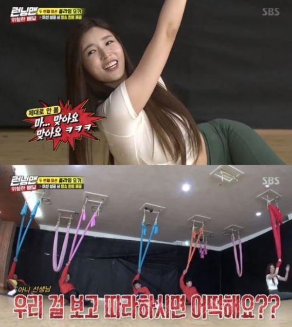 ‘런닝맨’ 멤버들의 플라잉 요가 강사로 등장한 유승옥이 이광수에게 플라잉 요가 자세를 가르쳐주었지만 런닝맨 대표 몸치 이광수는 잘 따라 하지 못했다.