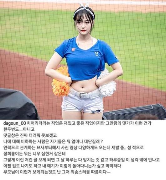 [스타인뉴스 이채원 기자] 삼성 라이온즈 치어리더 황다건이 자신을 성희롱하는 누리꾼들의 게시물에 고통 받고 있다고 전했다.