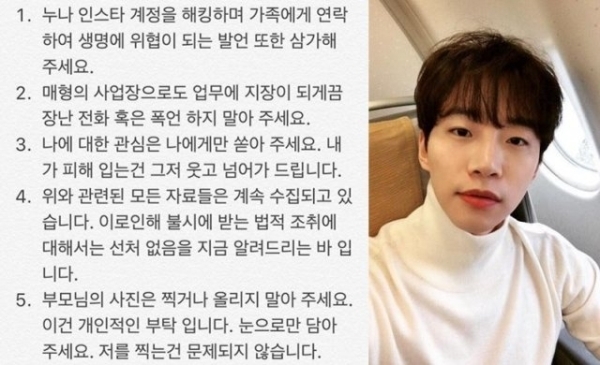 준호는 20일 오후 자신의 인스타그램 통해 "누나 인스타 계정을 해킹하며 가족에게 연락해 생명에 위협이 되는 발언을 삼가 해 달라"고 호소했다.