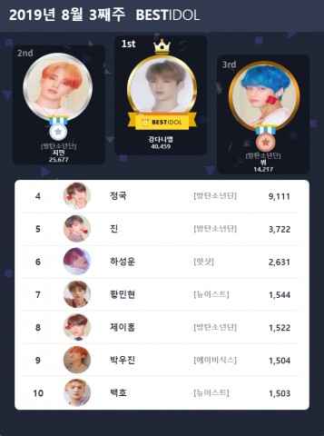 8위는 방탄소년단의 제이홉, 9위는 AB6IX의 박우진이, 10위는 뉴이스트의 백호가 차지하며 마감했다.