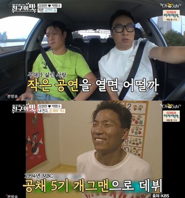박명수는 “내가 돈 못 벌 때 김철민은 계속 공연을 하지 않았냐. 김철민이 용돈 좀 생기고 하면 돼지 갈비도 사주고 그랬다. 나랑 둘이 나이트도 갔다. 없는 살림에 ‘내가 살게!’ (해준 사람.) 그 당시 내 주머니에는 3000원이 있었다”고 김철민에 고마운 마음을 전했다.