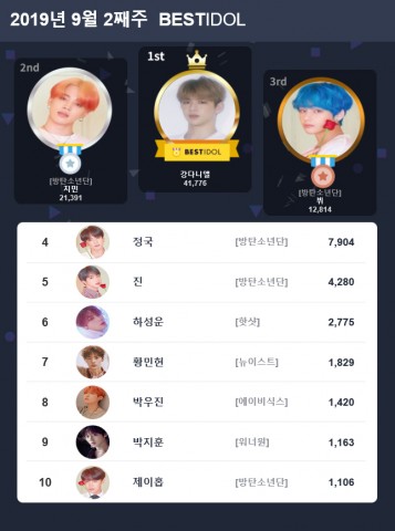 8위는 AB6IX의 박우진, 9위는 박지훈이, 10위는 방탄소년단의 제이홉이 차지하며 마감했다.