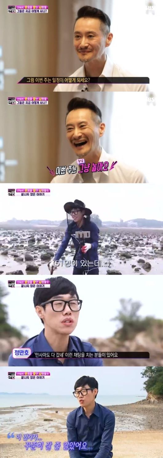 이후 정만호 역시 등장해 근황을 전했다. 이날 정만호는 갯벌에서 '인터넷 1인 방송'을 하는 모습을 보여줬는데. 정만호는 구독자수를 묻자 "51명. 50명 넘어도 많은 것. 이 시간대가 다들 직장에서 일하고 그래서 없지. 7시 넘어가면 시청자 수가 야무지다."고 능청스럽게 답했다.