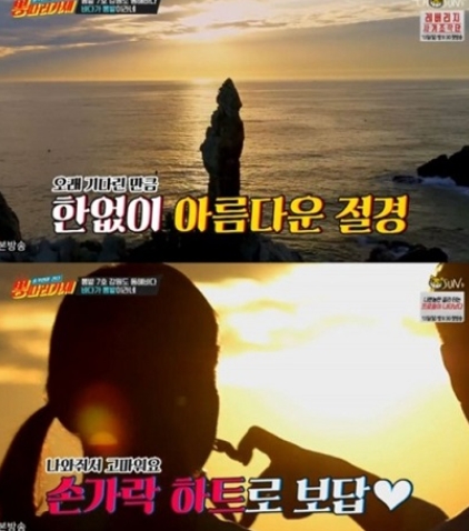 추암 촛대바위에 도착한 붐은 “나랑 해 보러 가지 않을래. 뽕도 따고 해도 같이 보고”라고 개사한 노래를 부르며 송가인에게 유혹 멘트를 날렸다.