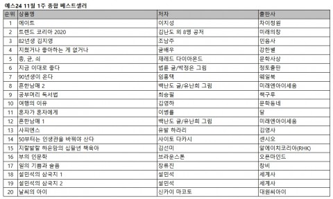 [스타인뉴스 김학철 기자] 예스24 11월 1주 종합 베스트셀러에서는 인공지능에게 대체되지 않는 방법론을 일러주는 이지성 작가의 <에이트>와 김난도 서울대 교수가 이끄는 서울대 생활과학연구소 소비트렌드분석센터가 2020년의 기술과 시장 핵심 트렌드를 분석한 <트렌드 코리아 2020>가 전주 대비 한 계단씩 올라 각각 1위, 2위에 새롭게 등극했다. 조남주 작가의 소설 <82년생 김지영>이 동명의 영화 개봉 일주일 만에 직전 동기간 대비 판매량이 99% 증가하며 지난주 1위에 등극한 이후 두 계단 하락해 3위에 머물렀고 무기력해진 마음에 다시 시작하고 싶은 의욕과 용기를 불러일으켜 주는 글배우 작가의 <지쳤거나 좋아하는 게 없거나>는 전주와 동일한 4위다.