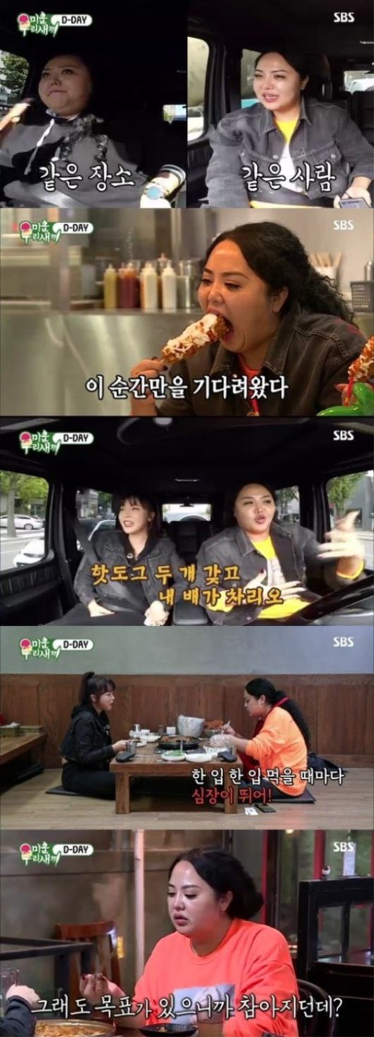 홍선영은 "피자, 치킨은 물론이고 자장면이 정말 먹고 싶었다"며 "떡볶이, 만두, 곱창도 먹고 싶었다"고 메뉴를 열거하며 치팅데이에 대한 기대감을 드러냈다. 먼저 홍자매는 핫도그 가게에 도착했고 핫도그 3개와 수박쥬스를 주문했다.