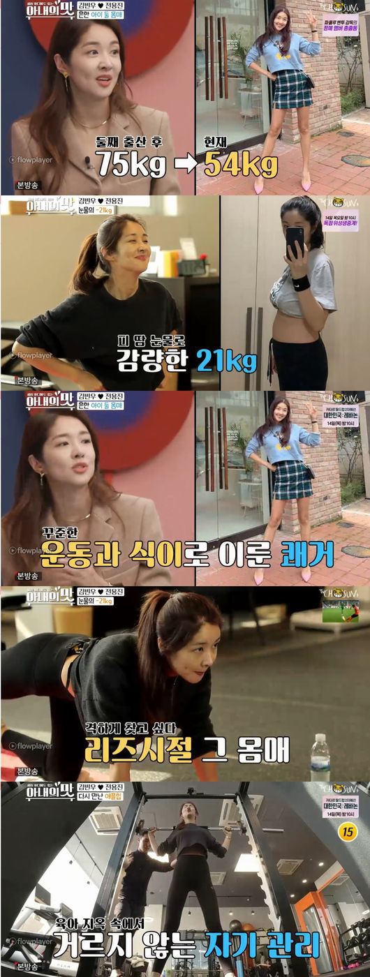 등원전쟁 끝낸 후 김빈우는 육아 지옥 속에서 운동의 끈을 놓을 수 없다며 헬스장을 찾았다. 키 171cm의 몸무게 54kg이라는 김빈우는 "출산후 75키로 였다, 9달만에 21키로 감량했다"면서 "갑자기 빼면 요요가 온다, 꾸준한 운동과 식이요법으로 건강하게 꾸준히 뺐다"고 말해 놀라움을 안겼다.