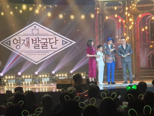 사진 속 유산슬은 '영재발굴단' 무대 위에서 MC들과 나란히 서서 이야기 중이다. 이어진 사진에서는 홀로 무대에서 노래하고 있다.