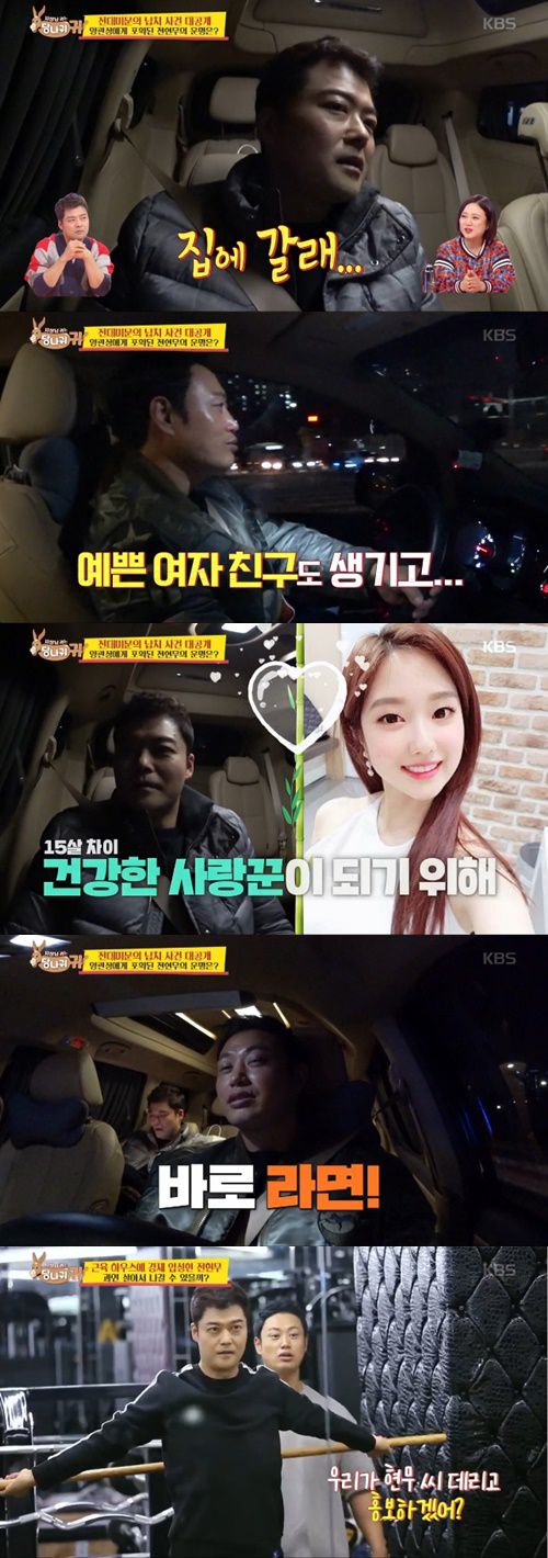 전현무는 소리치며 매니저를 찾았지만, 양치승은 개의치 않고 "예쁜 여자친구도 이제 생기지 않았냐"며 이혜성 아나운서를 언급했다. 이어 "몸 관리해야 한다"며 "잘하면 라면도 끓여주겠다"고 설득했다.