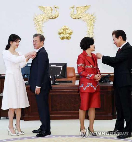 수지는 단정한 흰 드레스에 사랑의 열매 배지를 착용하고 등장했다. 이어 그는 문재인 대통령의 가슴에 사랑의 열매 배지를 달았다. 훈훈한 분위기가 전해졌다.