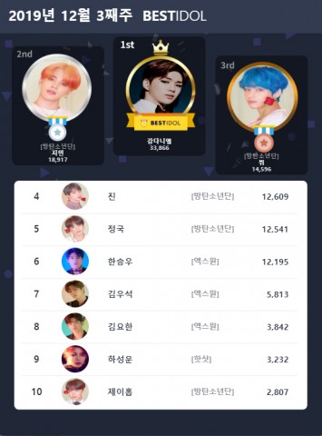 4위는 방탄소년단의 진이 차지했으며 5위는 지난주보다 1계단 상승한 방탄소년단의 정국이 차지했다.
