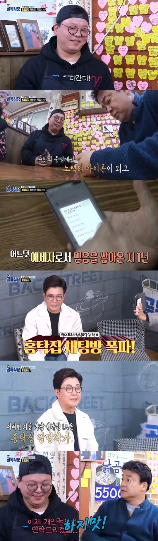 이날 백종원은 홍탁집에 기습 방문해 사장과 만났다. 홍탁집 사장은 1년 전 작성한 각서 그대로 지금까지 백종원에 매일 출퇴근 보고를 하고 있었다고. 각서 기한이 만료됨에 따라 각서를 뗀 백종원은 “자유를 주겠다”며 그간 보고를 받던 채팅창을 폭파했다.