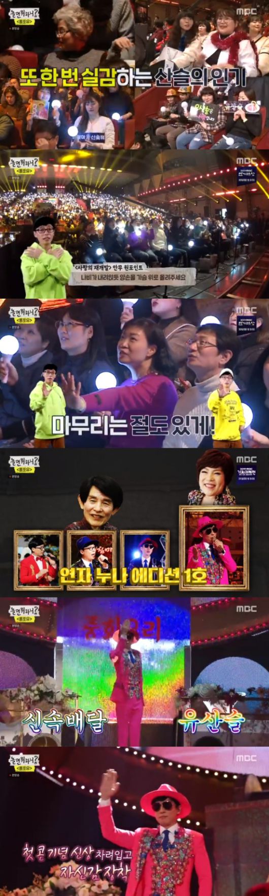 지난 28일 방송된 MBC ‘놀면 뭐하니?-뽕포유’에는 트로트 영재에서 대세로 거듭난 ‘유산슬 1집 굿바이 콘서트’가 공개돼 안방 1열 팬들을 떼창과 흥이 폭발했던 현장으로 완벽하게 소환했다.