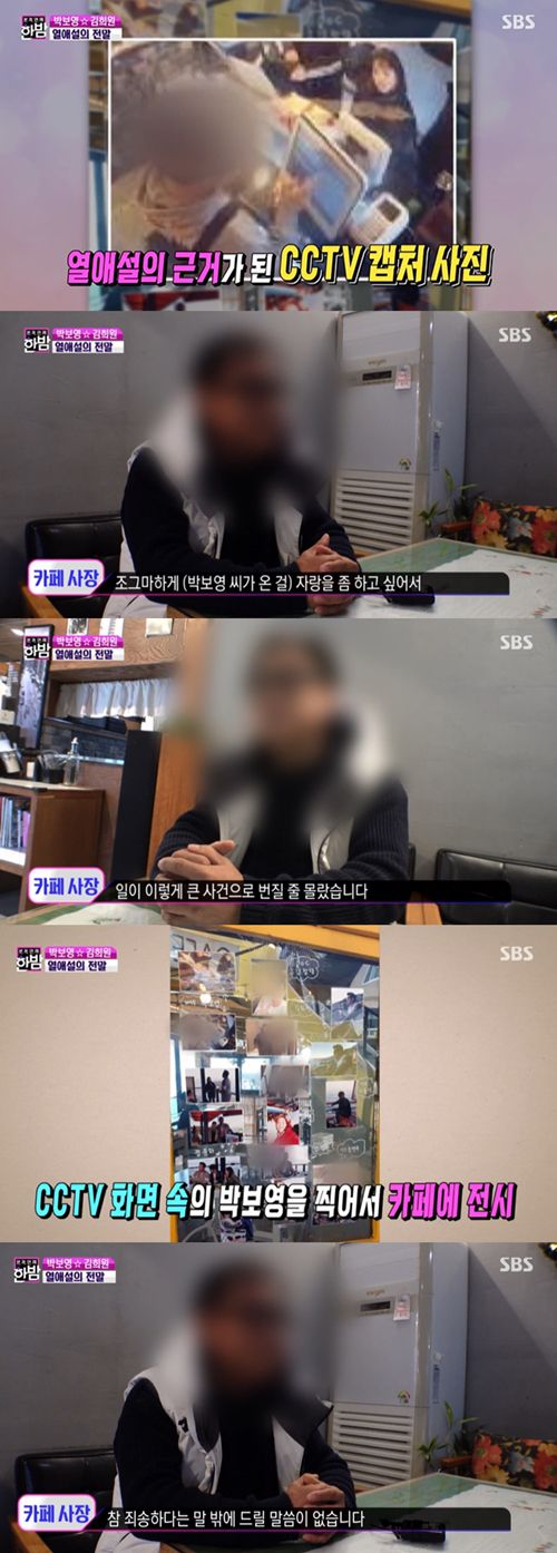 8일 방송된 SBS '본격연예 한밤'은 박보영 일행이 지난달 찾은 카페 주인을 인터뷰했다. 카페 주인은 "(박보영이 온 걸) 조그마하게 자랑 좀 하고 싶어가지고 (캡처) 사진을 붙였다"라며 "일이 이렇게 큰 사건으로 번질 줄 몰랐다. 사죄를 어떻게 드려야 할지 모르겠다. 죄송하다는 말밖에 드릴 말씀이 없다"라고 밝혔다.