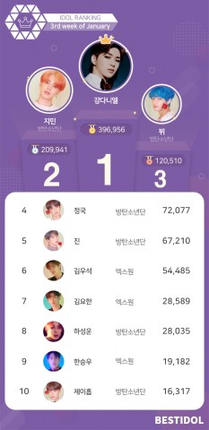 2020년 1월 13일부터 1월 19일까지 진행된 1월 셋째 주 투표에서 강다니엘이 30주 연속 BESTIDOL로 선정되었다.