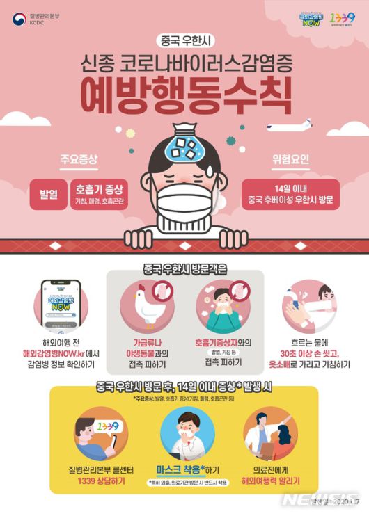 중국 우한 지역을 비롯해 감염 발생지역에 방문을 자제하는 것도 중요하다. 중국 방문이 불가피하다면, 현지에서 많은 사람이 밀집하는 장소를 피해야 한다. 가금류와 야생동물과 접촉하는 것도 위험하다. 특히 우한시를 비롯해 중국 후베이성 지역을 여행한 후 14일 이내 발열 또는 기침, 인후통 등이 발생할 경우 임의로 병,의원을 방문하지 않아야 한다. 우선 질병관리본부 콜센터 1339나 보건소에 문의 후 선별진료소를 방문해야 한다. 이 때 해외 여행력을 의료진에게 알려야 한다.