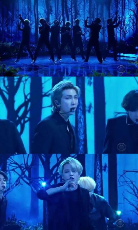 Wearing black outfits on the show, BTS took off its socks as well as shoes and went on stage barefoot. It was impressive to see the choreography highlighting the curves that used the movements of modern dance instead of the traditional K-pop dance. In particular, Jimin's movements were noticeable when he was exposed to modern dance among the members. The backdrop of the black forest motibble spread light and light to a curved line.
